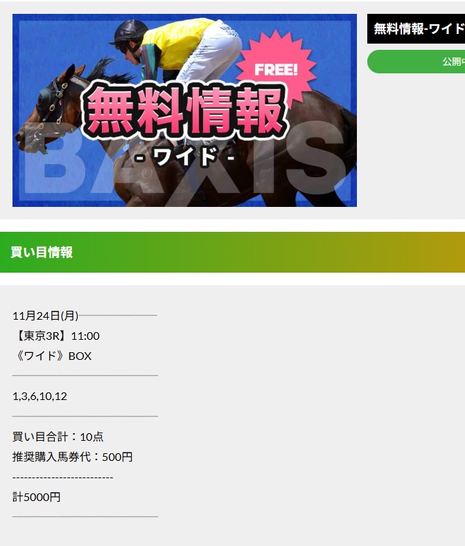バクシスの無料予想は、3連複買ったらいかん!ワイドだけ買っとけばいい感じですね✨先週は土曜日10点で13.6倍的中。1点1000円で俺は買ってたから、3600円勝ち✨良い感じに夜の飲み代浮きました✨