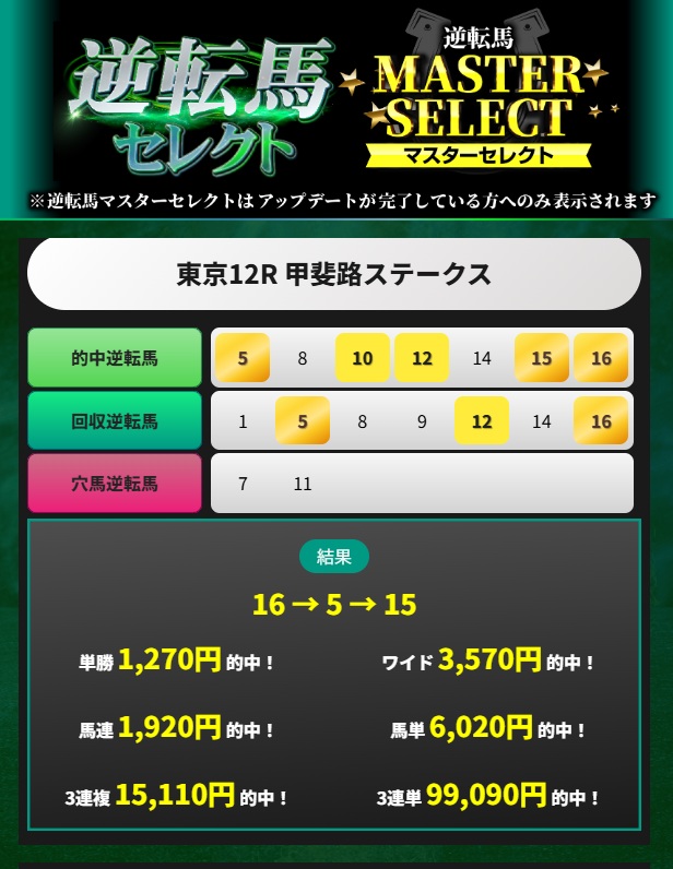自分のやり方を信じてきて実りました。先週逆転場セレクトで3連単22万馬券を取れました。1点100円かけで22万ちょっとの配当でしたけど満足です。引き続き研究していきます。この的中をきっかけに自分はアップグレードして逆転馬マスターセレクトを契約しました。今週も勝ちにいきます。