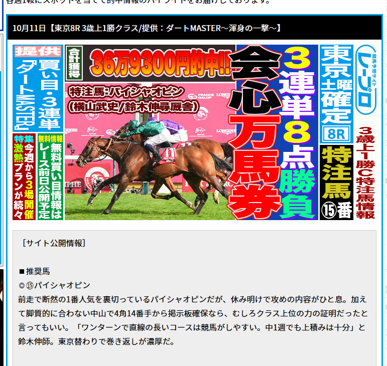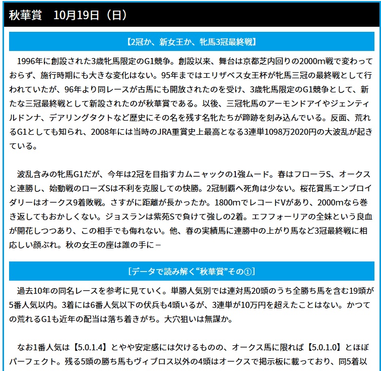 週末の注目レースで秋華賞がピックアップされた。先週も先々週も俺はこの情報で馬絞れたし無料で見れるし、ほんと個人的に良い情報だと思ったのでお勧めします。重賞やる人は見た方が良いと思ってここに投稿させてもらいました。