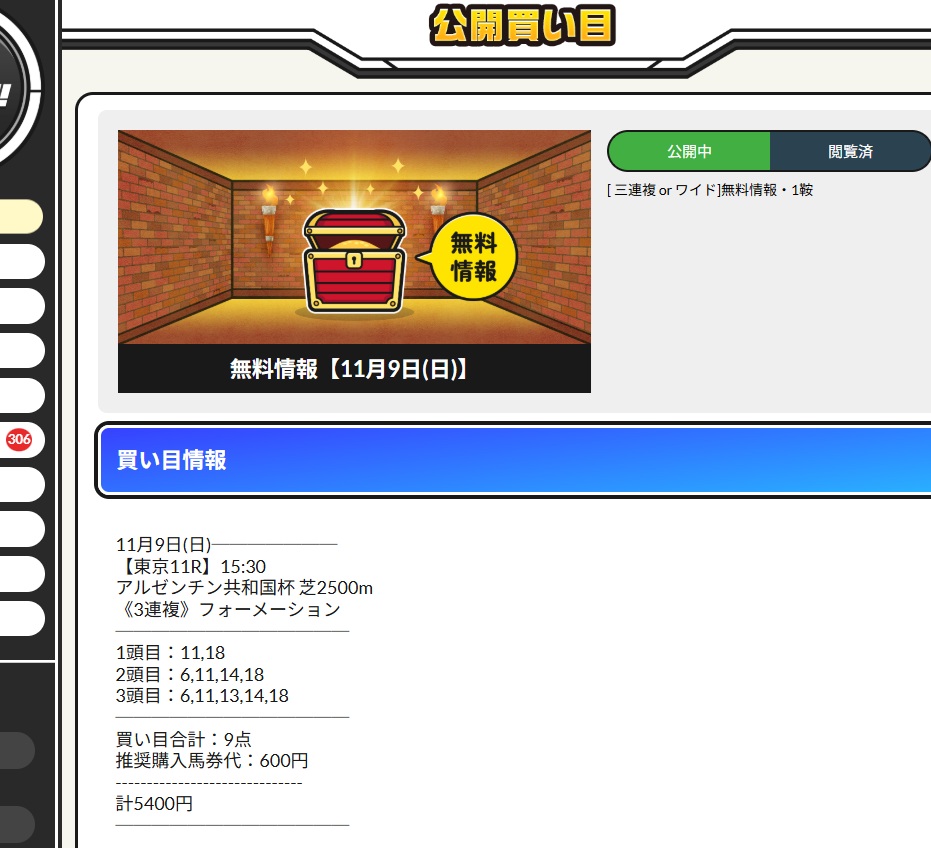 天皇賞秋的中。アルゼンチン共和国杯的中。無料予想2週連続的中で+8万円。この3連複の無料予想がいつか有料予想にならないように祈ります。。。無料で使えるうちに稼いでおく。ですね。